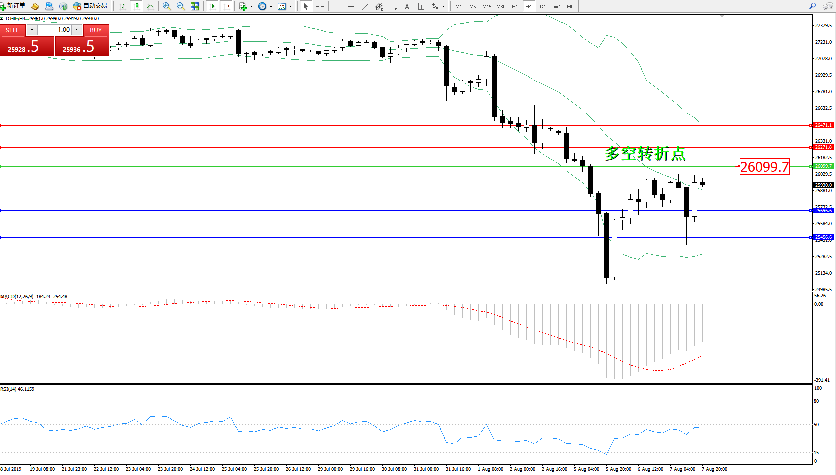 道琼斯指数DJ30—— 4小时K线图显示: