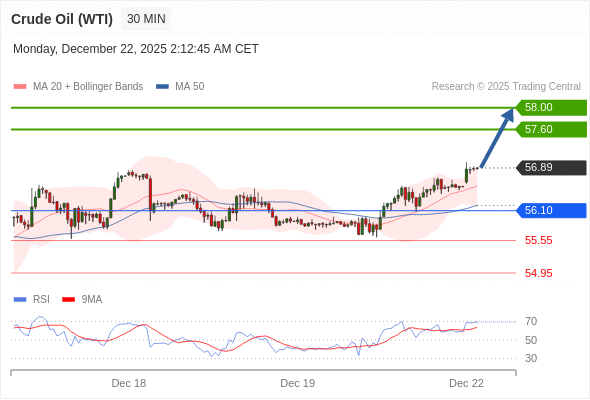 在 56.10 之上,看涨,目标价位为 57.60 ,然后为 58.00 。