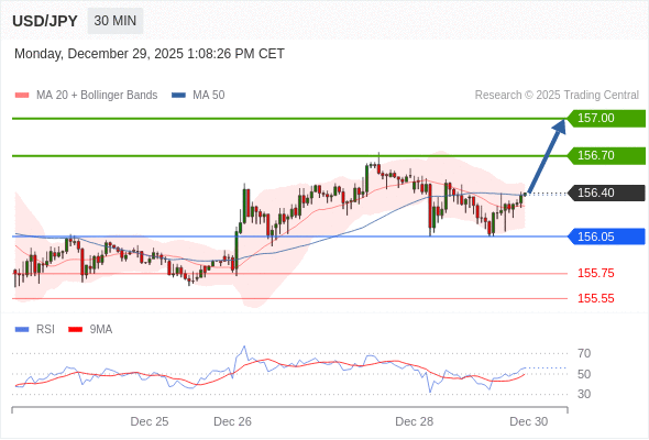 在 156.05 之上,看涨,目标价位为 156.70 ,然后为 157.00 。