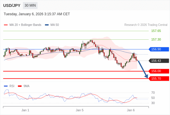 在 156.90 之下,看跌,目标价位为 156.00 ,然后为 155.70 。