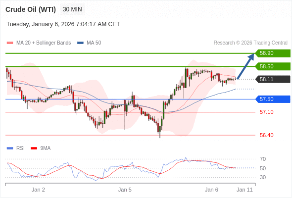 在 57.50 之上,看涨,目标价位为 58.50 ,然后为 58.90 。