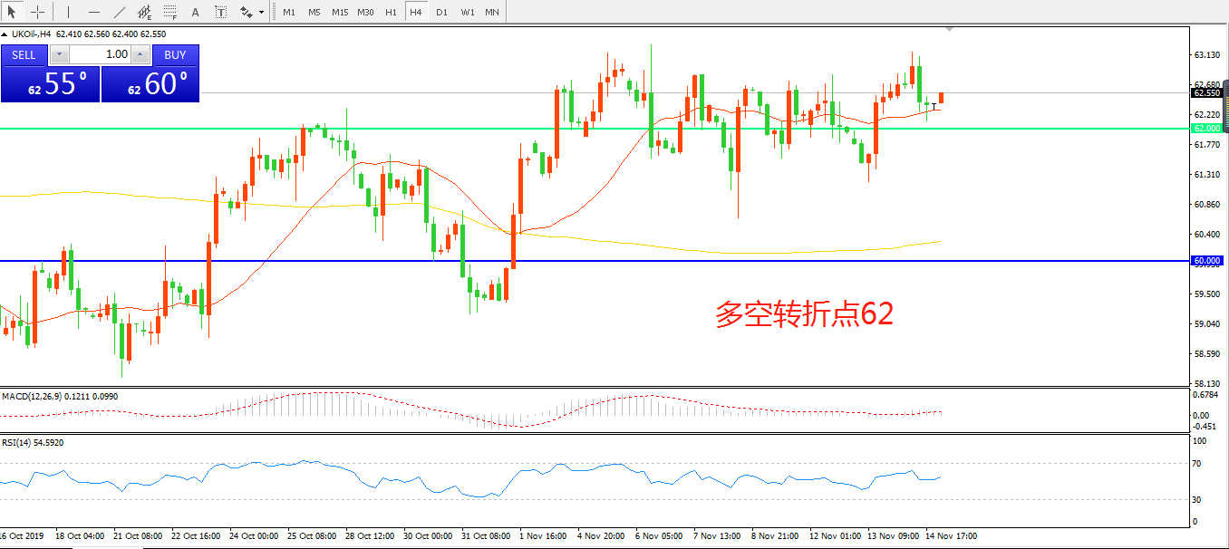 4小时图看,油价虽有回踩动作,但62美金支撑仍然强劲,均线系统走平,MACD红柱增加,RSI指标拐头向上,日内上行概率较大。