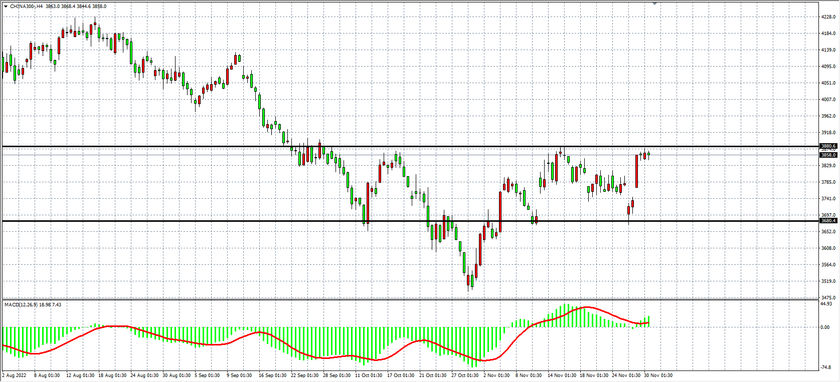 4小时图看,沪深3000在前低点3680之上继续走强,MACD量能柱在零轴之上开始放量,日内有望延续涨势,第一压力关注3880,上破看至 4000点附近。