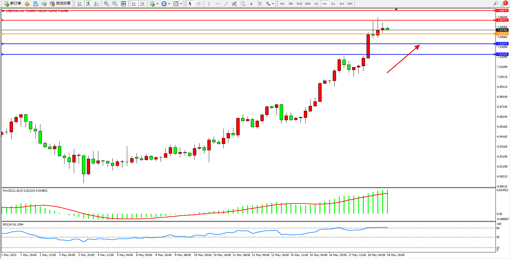美元人民币USDCNH——4小时K线图显示: