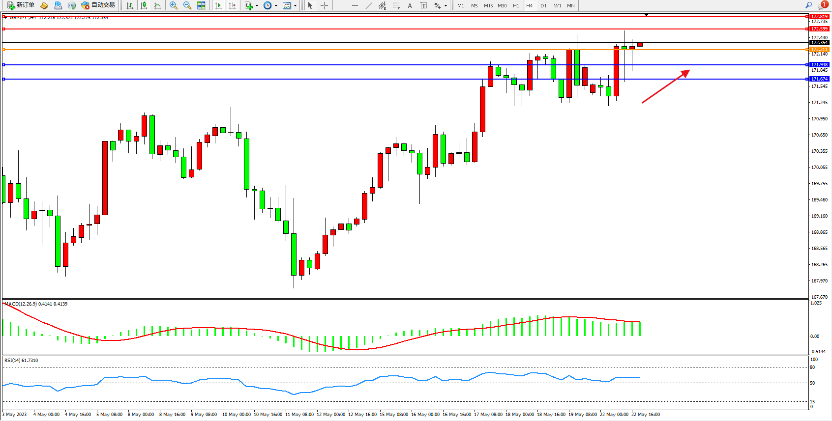交易策略:172.211上方看涨,目标172.599  173.819