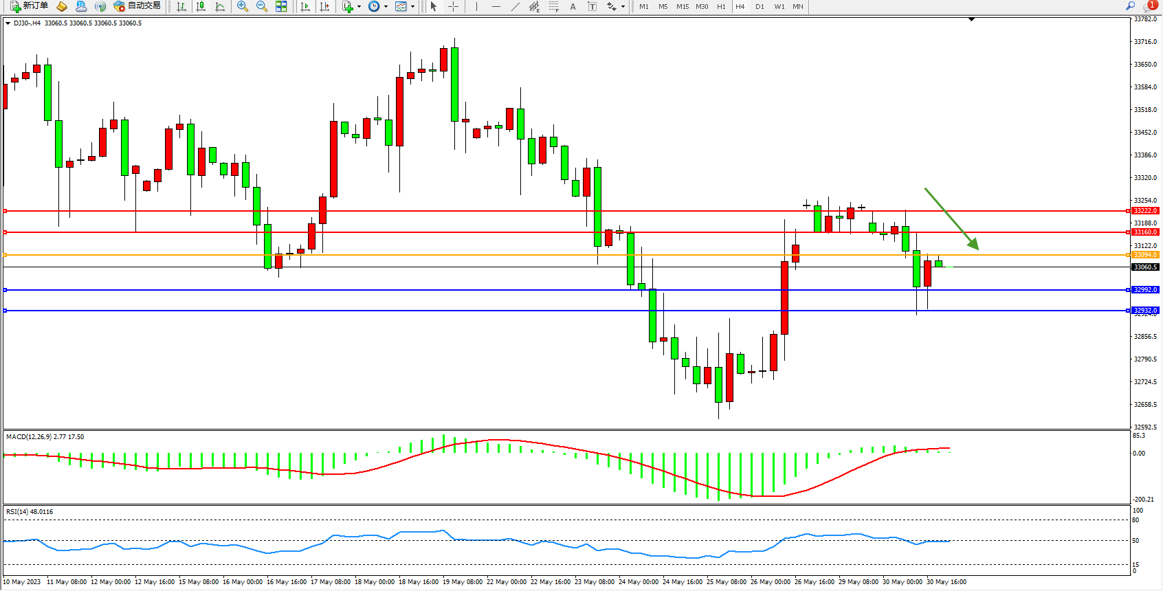 交易策略:33094下方看跌,目标32992 32932