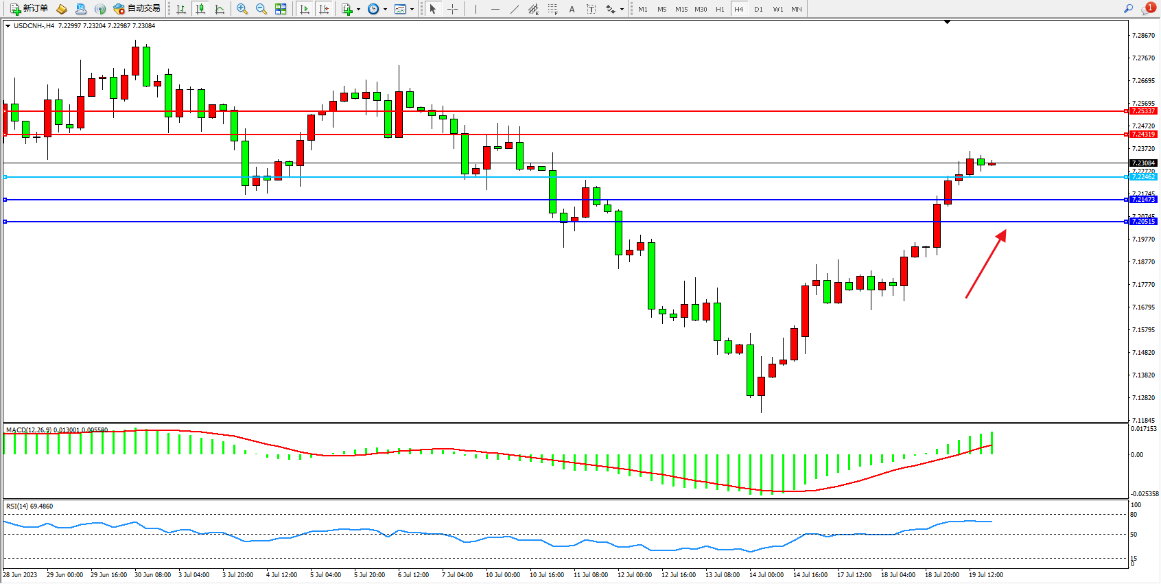 美元人民币USDCNH——4小时K线图显示: