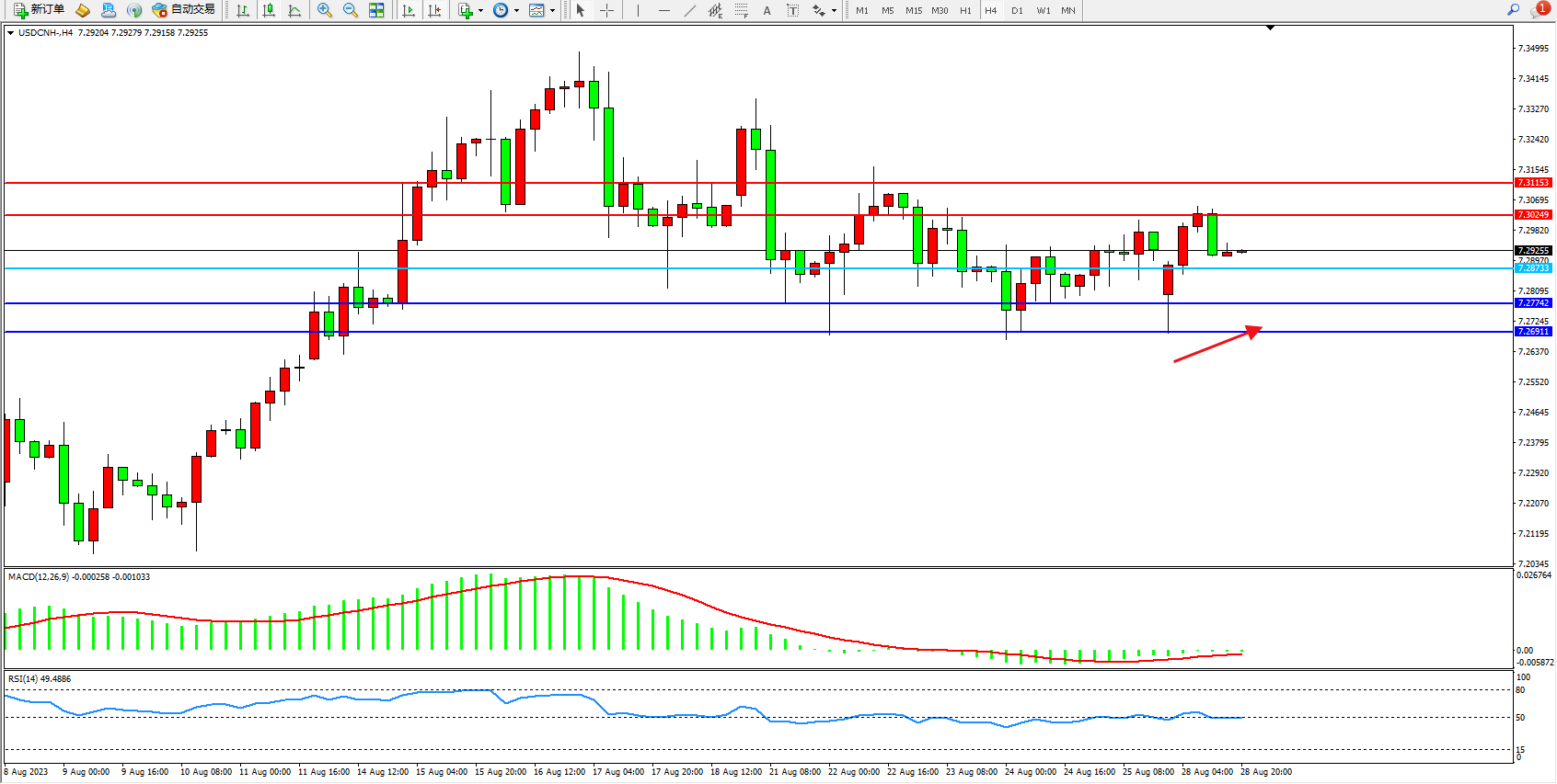 交易策略:7.28733上方看涨,目标7.30249 7.31151