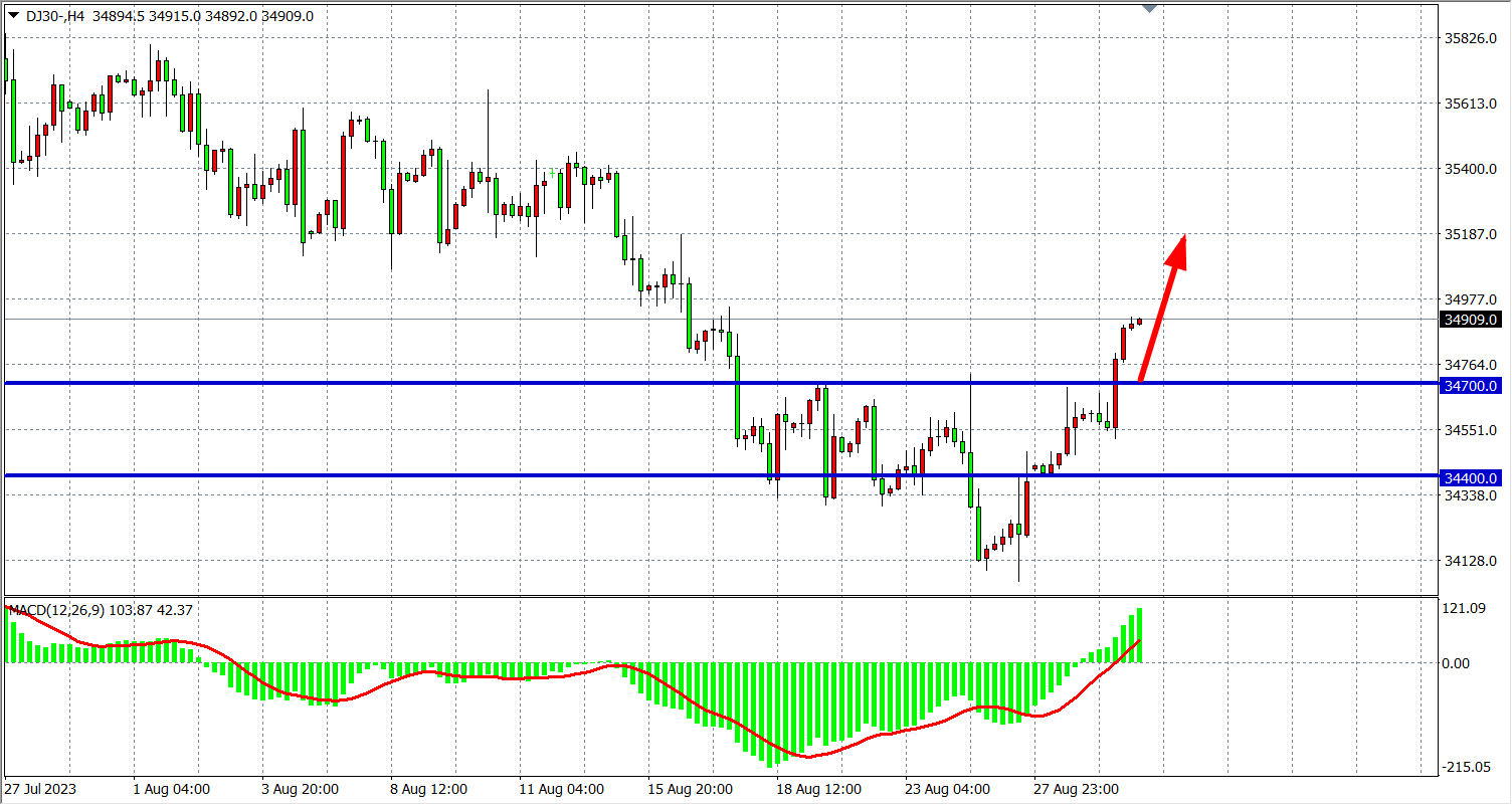 4小时图看,道指进一步上破34700一线,MACD量能在零轴上放量,上方继续看35000-35400。