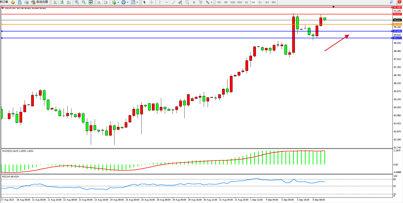布油维持90.641附近震荡,布伦特原油价格接近每桶90美元,加剧了对经济增长放缓和通胀持续的担忧,此前最大的OPEC+产油国将减产协议延长至年底。