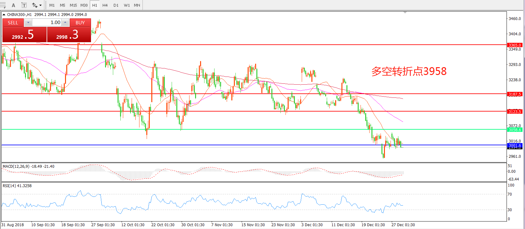 1小时图看,CHINA300中华指数触及3000支撑小幅反弹后再次走低,整体走势依旧偏弱,均线系统呈空头排列, MACD绿柱缩短,RSI持有拐头迹象,短线震荡偏空