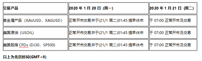 由于中国农历新年春节假期和美国马丁路德金纪念日假期影响,以下交易产品的交易时间将因假期提早或全日休市,敬请阁下留意知悉!